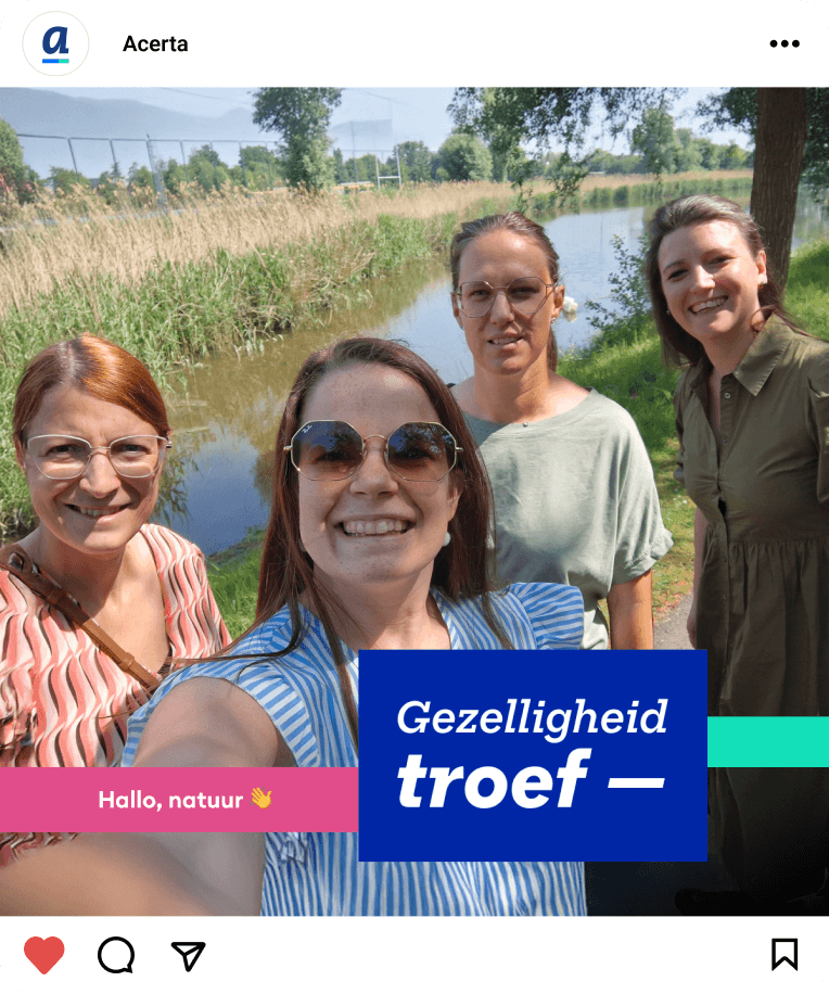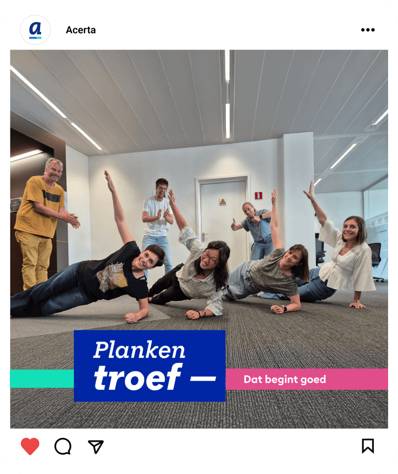 De collega’s van Acerta? Dat zijn de #GrootsteTroeven. Met De Grootste Proef (see what we did there?) delen de collega’s zich op in kleine teams. In 3 sprints van een maand strijden ze challenge per challenge voor de finale. Speel ‘De vloer is lava’, recreëer onze campagnefoto, ‘hoe ziet je bureau er nu uit?’? Elke week krijgen ze 2 nieuwe opdrachten.