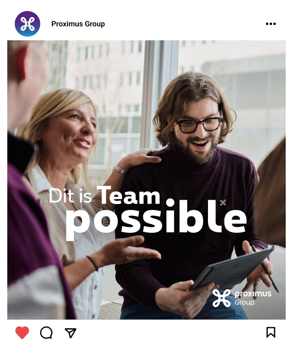 We starten vanuit jullie input en bouwen daarop een verhaal dat herkenbaar is. Een EVP dat uitblinkt in z’n eenvoud. Dat je durft delen en leeft onder de collega’s. Da’s soms een #HerkenbareHashtag, soms een groepsnaam die voortbouwt op een bestaande strategie (zoals Team possible bij Proximus).